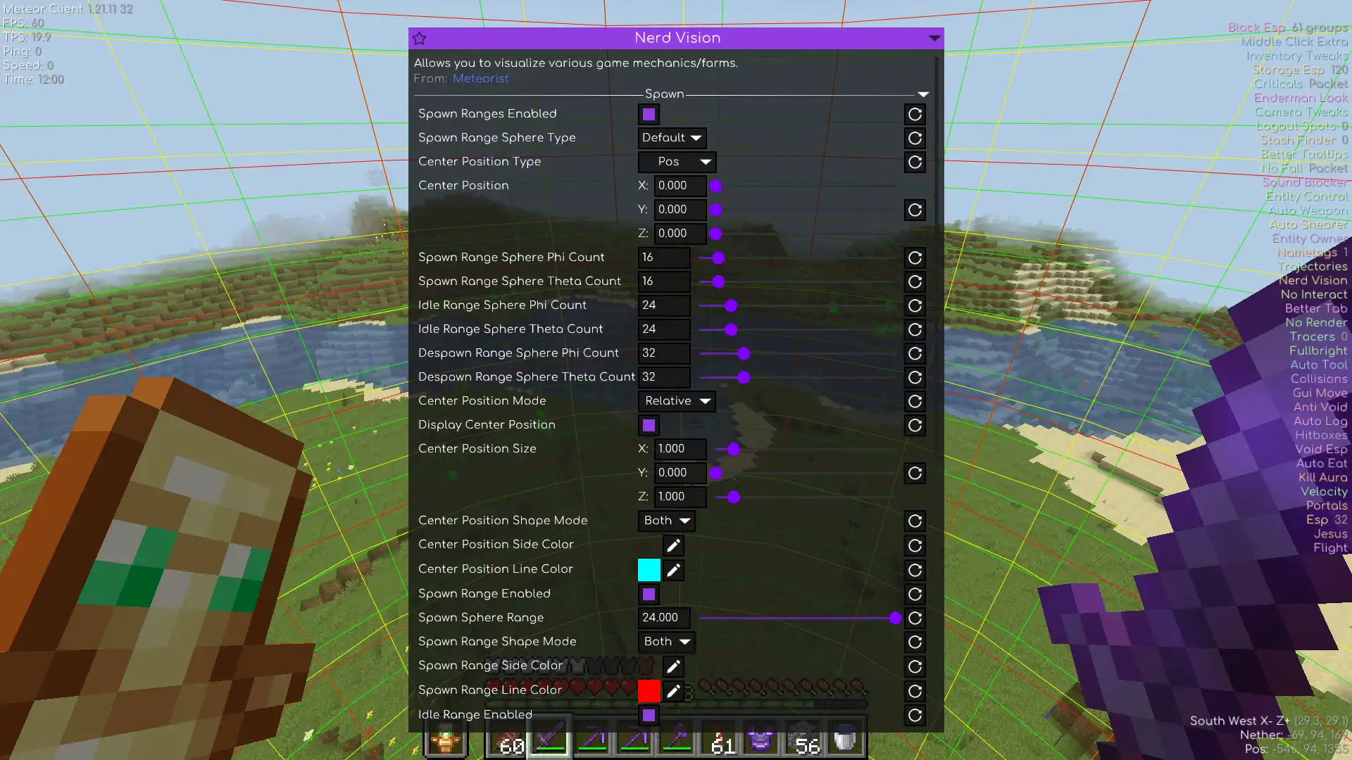 Visualize game mechanics with Nerd Vision: see mob spawn ranges, turtle egg zones, spawner areas, and more.